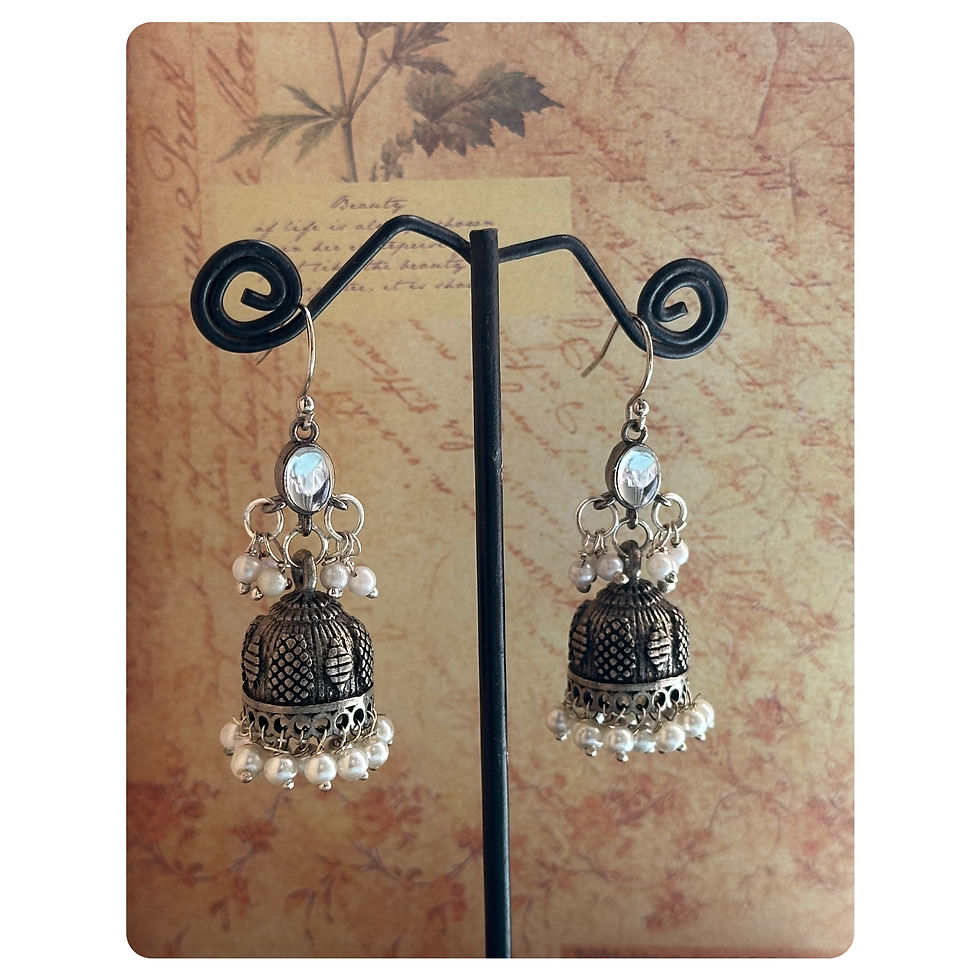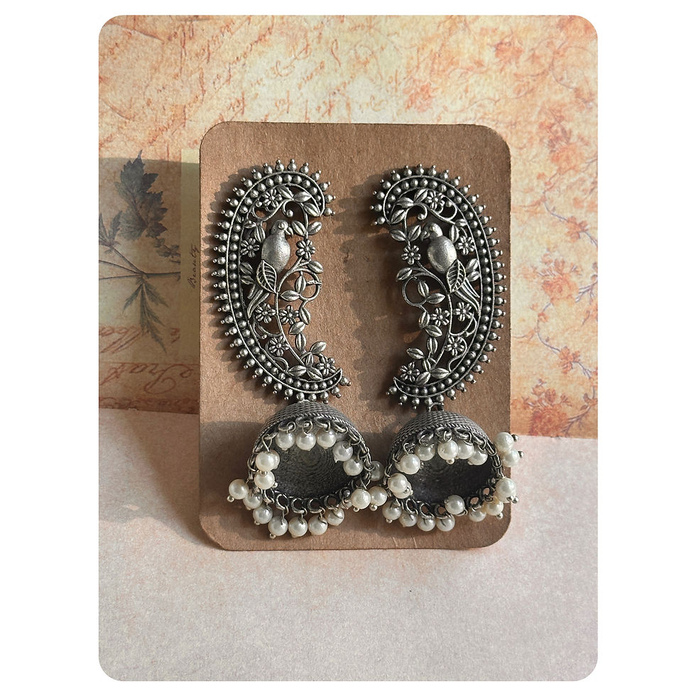 Silver Oxidised Dual Elephant Motif Pearl Layered Jhumka