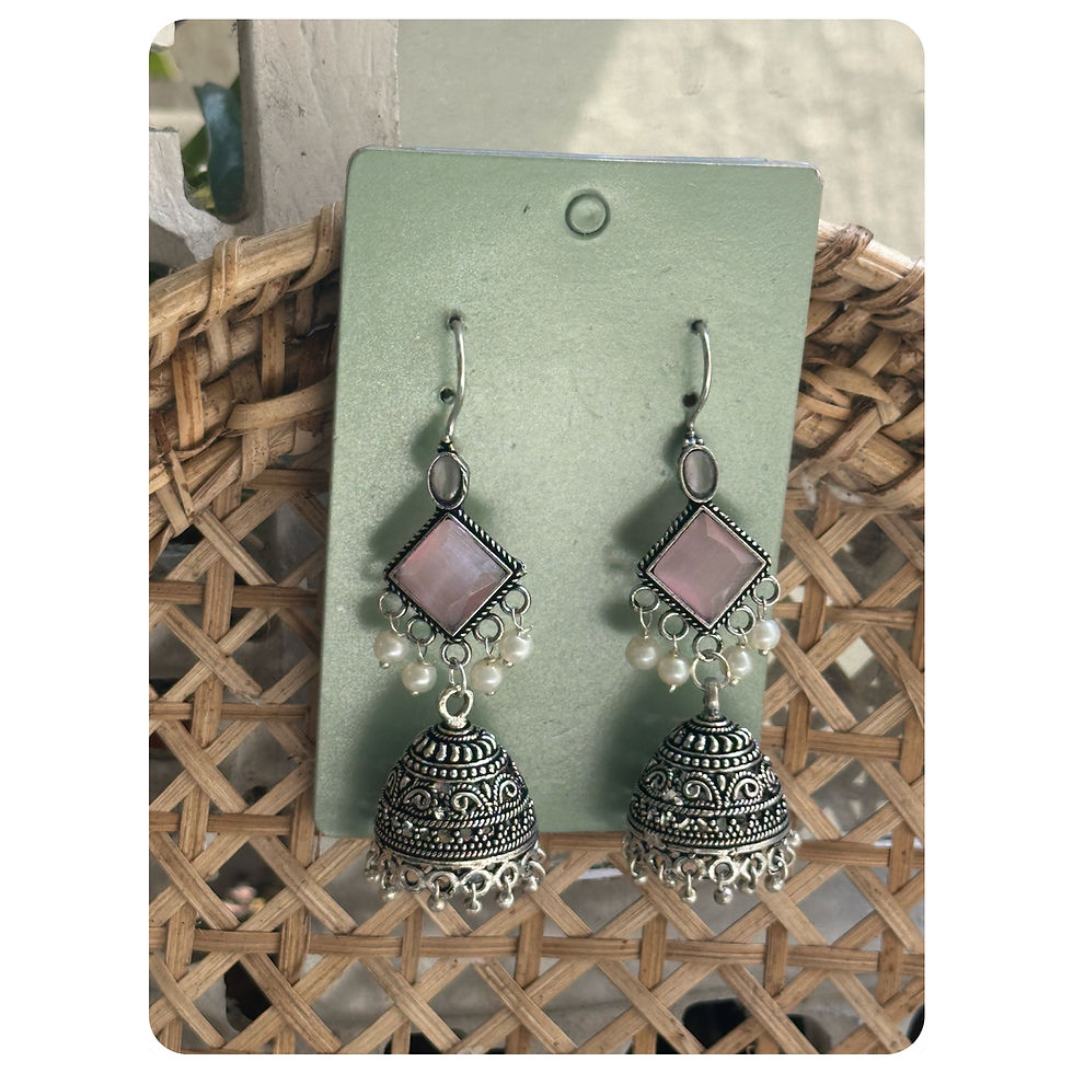 Silver Toned Baby Pink Stone Embellished Jhumka