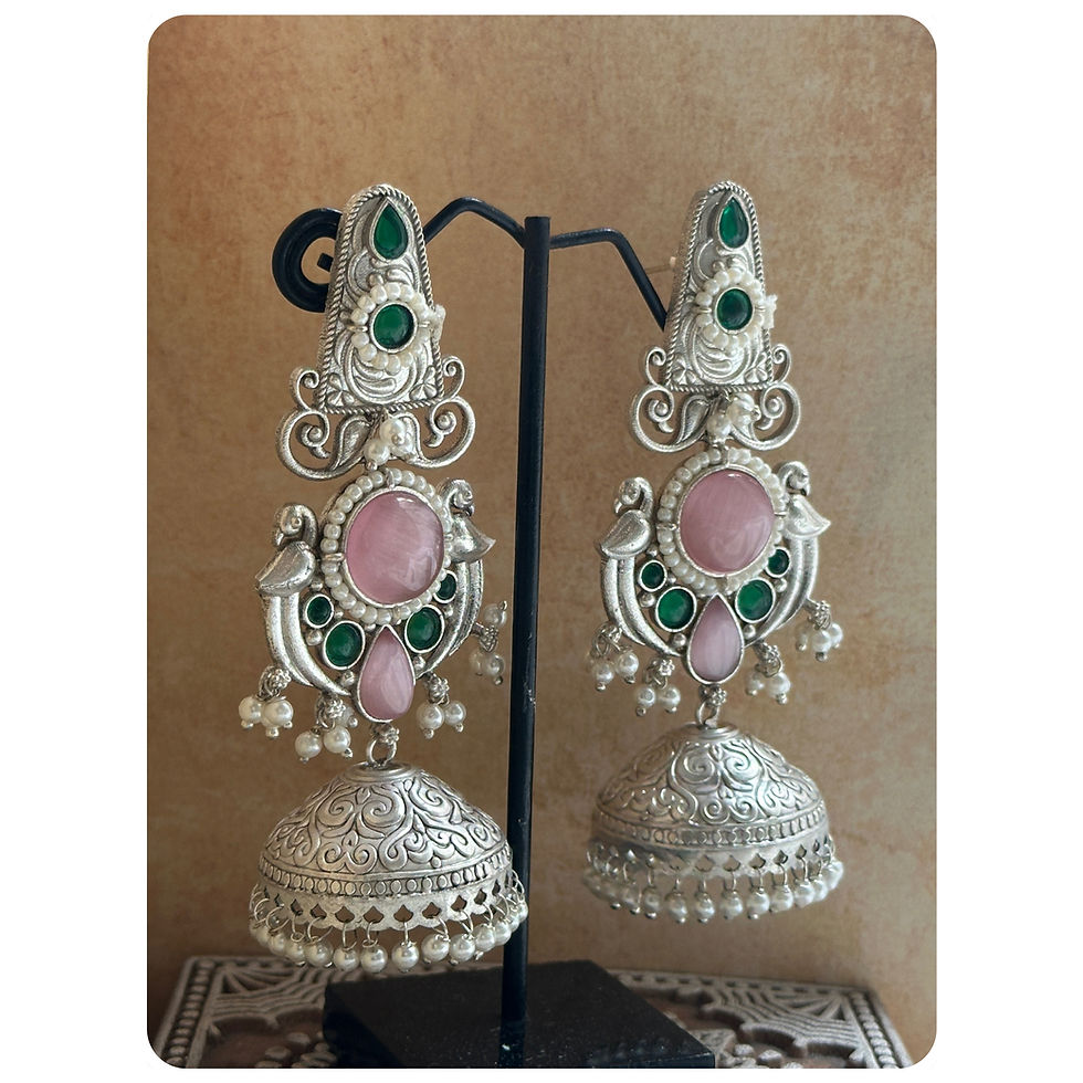 Silver Oxidised Baby Pink and Green Stone Embellished Oversized Jhumkas