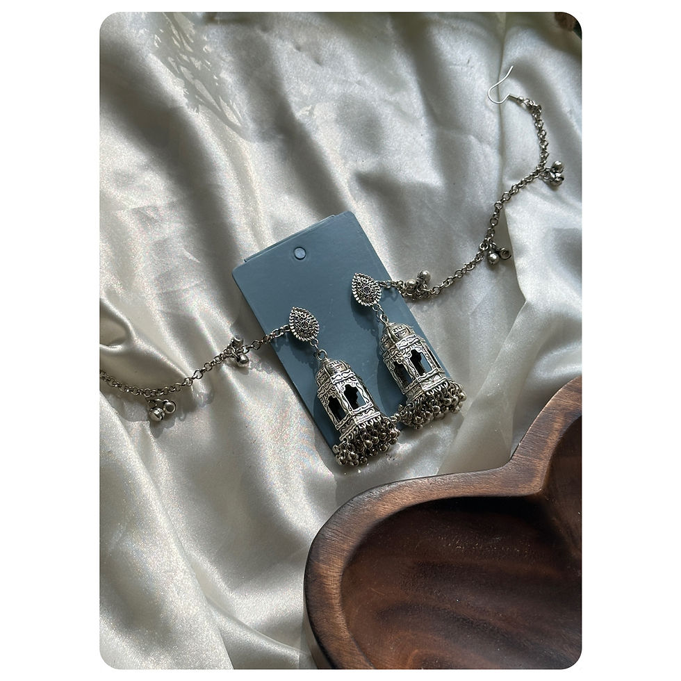 Silver Toned “Radhe Krishna” Scripted Hair Chain Jhumka