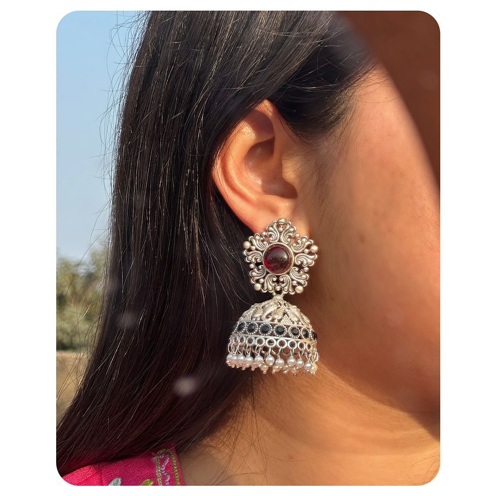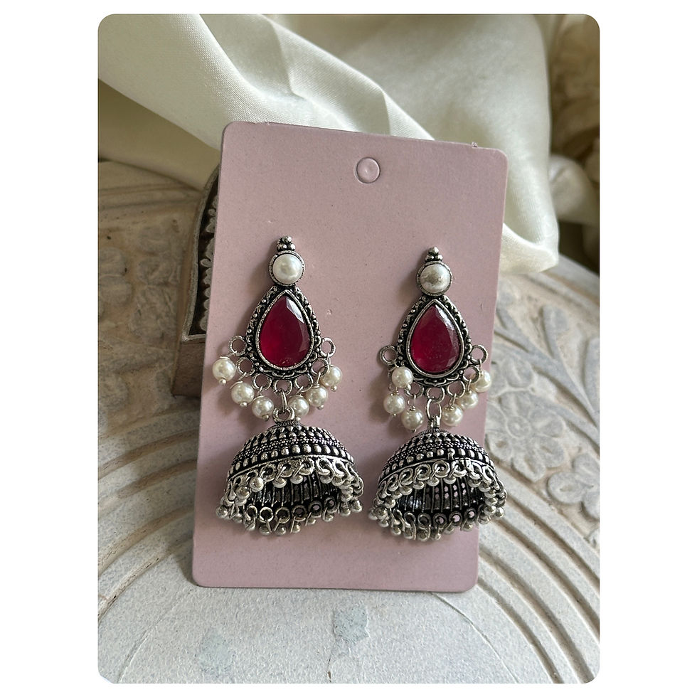 Silver Oxidised Ruby and Black Stone Embellished Jhumkas